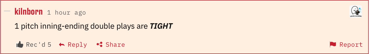 It was a fairly well-attended Gameday Thread, with 212 comments as of this writing. CotG goes to kilnborn, who made some reference that I don’t get, but whose comment squared nicely with my own sentiments today.