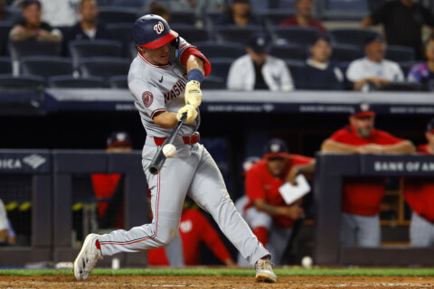 Washington Nationals’ Jacob Young hits a grand slam during the ninth inning of a baseball game against the New York Yankees, Monday, Aug. 25, 2025, in New York. (AP Photo/Noah K. Murray)(AP/Noah K. Murray)