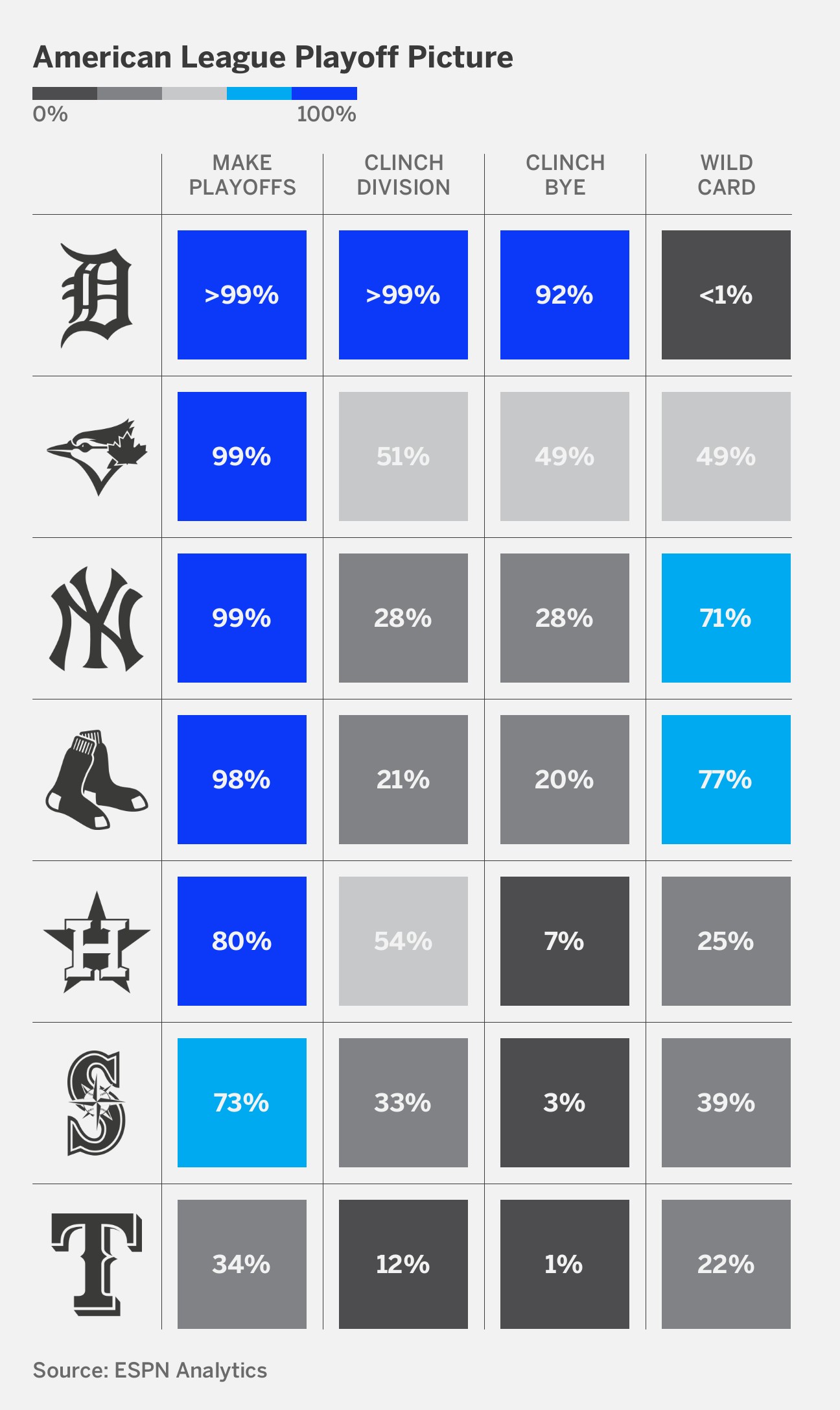 The Blue Jays and Tigers enter the homestretch battling for the AL’s No. 1 seed, with Detroit all but a lock for the AL Central crown. While Toronto sits atop the AL East, the Boston Red Sox and New York Yankees are duking it out for wild-card seeding. And, in what seems to be a yearly September occurrence, the Houston Astros are attempting to separate themselves from the Seattle Mariners in a two-team AL West race.