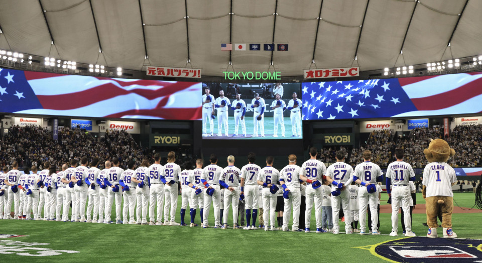 The Chicago Cubs listen to the U.S. national anthem prior to an exhibition game against the Hanshin Tigers at Tokyo Dome on March 15, 2025. (Pool photo)(Kyodo)