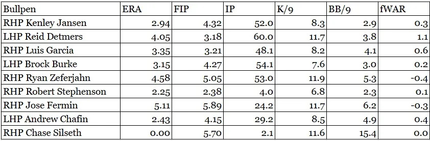 The Angels bullpen has a 4.83 ERA, third-worst in baseball. They have 28 blown saves, most in baseball, although closer Kenley Jansen has converted 25-of-26 save opportunities. Their relievers allow 37 percent of inherited runners score, the third-highest rate. Luis García has allowed just one earned run in 11 innings since joining the Angels. Ryan Zeferjahn has the eighth-highest walk rate among relievers.