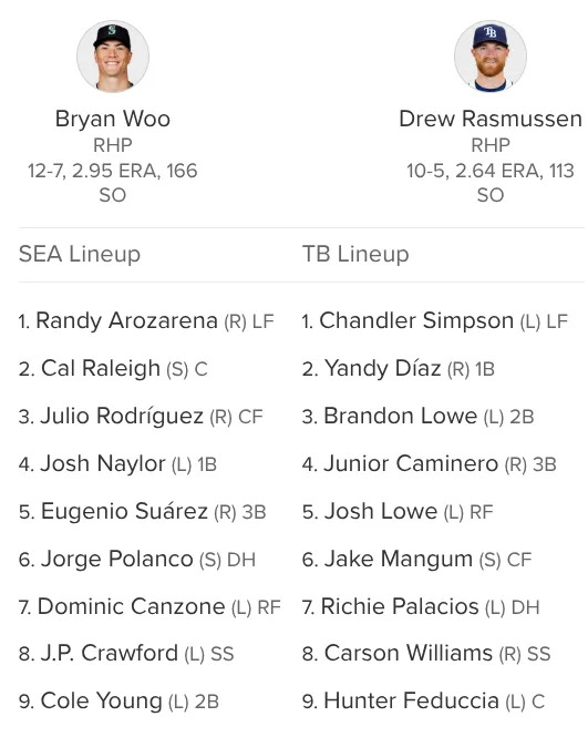 Maybe today’s the day we’ll see Harry Ford make his MLB debut. You know how we love a debut. It won’t be in the starting lineup though, as Manager Dan Wilson is going with the now-standard alignment. They’ll have to face off against Drew Rasmussen, who pretty well manhandled them for six scoreless innings in August. That’s hardly damning for Seattle’s lineup, as Rasmussen has quietly been one of MLB’s best starters when healthy over the past five years. He’s only averaged 85 innings per season over that stretch, but he’s also got a 2.75 ERA and 3.08 FIP.