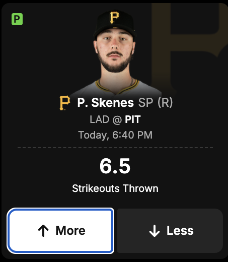 Create a Pick Set by choosing 2+ players from the same sport and Pick Group (a set of picks available from a group of set competitions). For each player, simply select if you think they’ll have more or less than their listed stat projection. In each Pick Set, you can not pick the same player twice and you must pick players from at least two different teams.