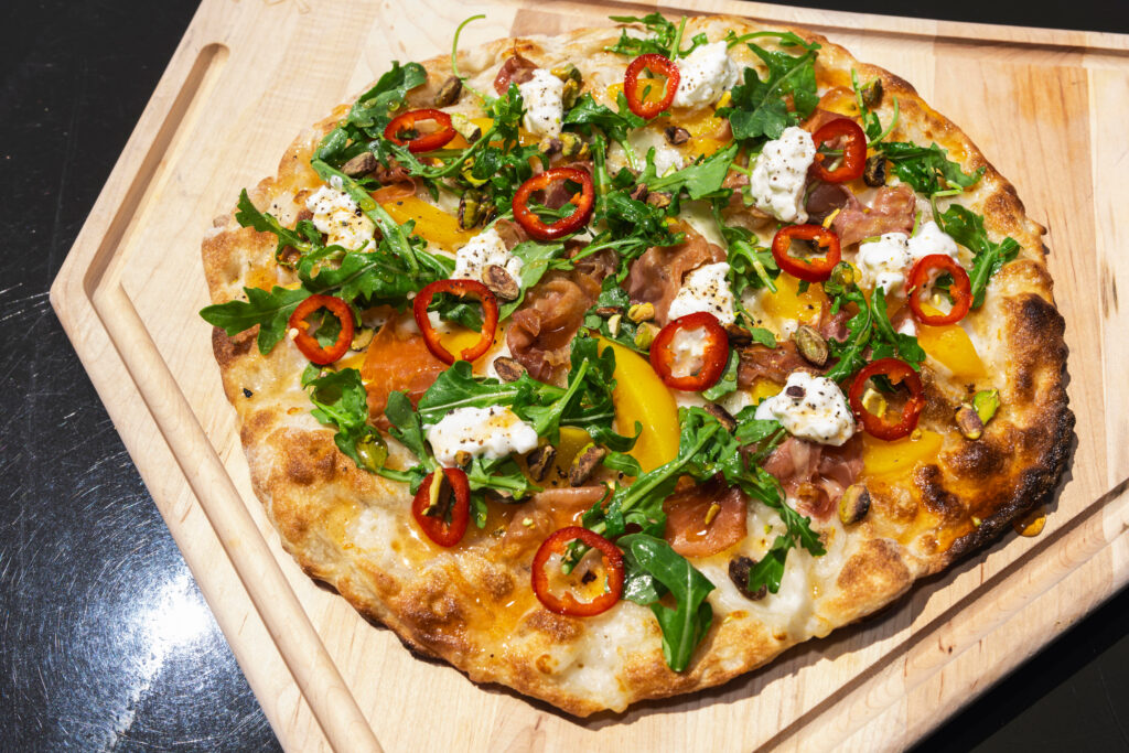 A fiery twist featuring stracciatella, prosciutto, grilled peaches, pistachio, hot honey and sliced Fresno peppers.