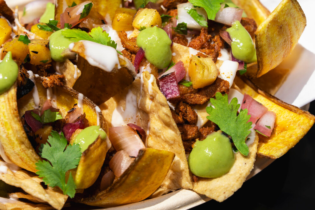 A vibrant fusion of tortilla and plantain chips topped with queso, pork adobada, avocado salsa, grilled pineapple and onion.