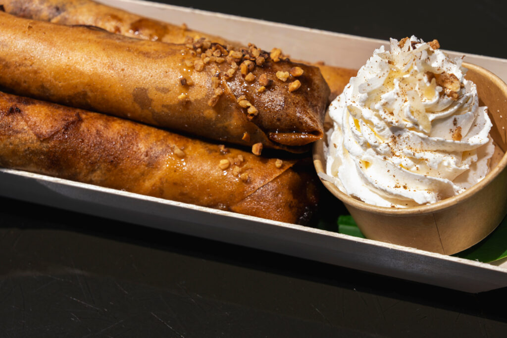 A decadent dessert roll filled with banana, chocolate, hazelnut, mazapan butter and topped with horchata whipped crème.