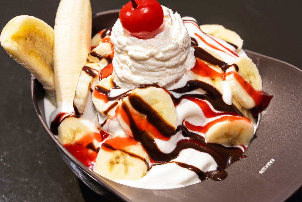Classic ballpark indulgence with soft serve, banana, whipped cream, chocolate and strawberry sauces, and a cherry on top.