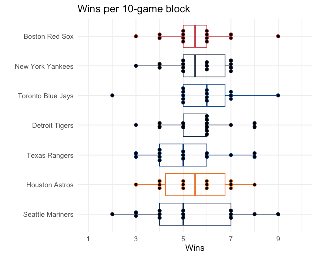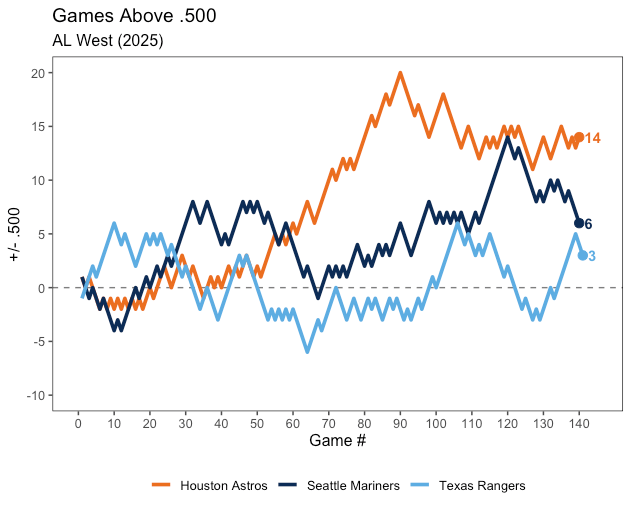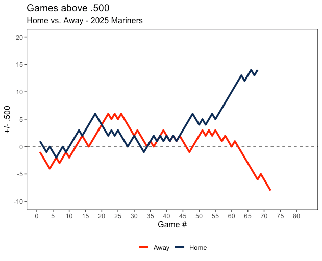 I split the season into 14 discrete 10-game stretches (one right after the other) and found the number of wins for each stretch. The Mariners have the largest standard deviation of wins in MLB, implying they’ve been the least consistent team of 2025. They have five stretches of seven wins or more (the most in AL). They have three stretches of three wins or fewer (the most among AL contenders). They don’t have a stretch of six wins.