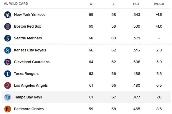 These guys again. They mostly sold at the Trade Deadline and were essentially buried! As of the end of play on August 21st, this is how far back they were in the Wild Card picture (shortly after the Yankees hammered them with homers in that two-game set at Steinbrenner Field):