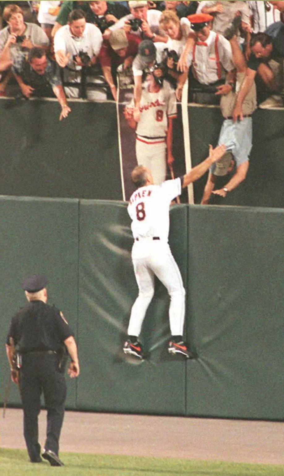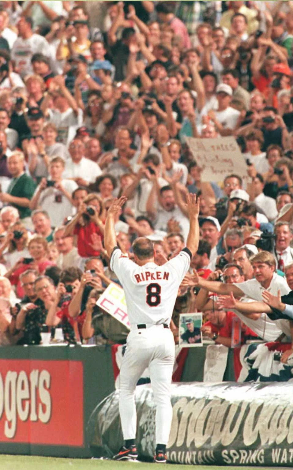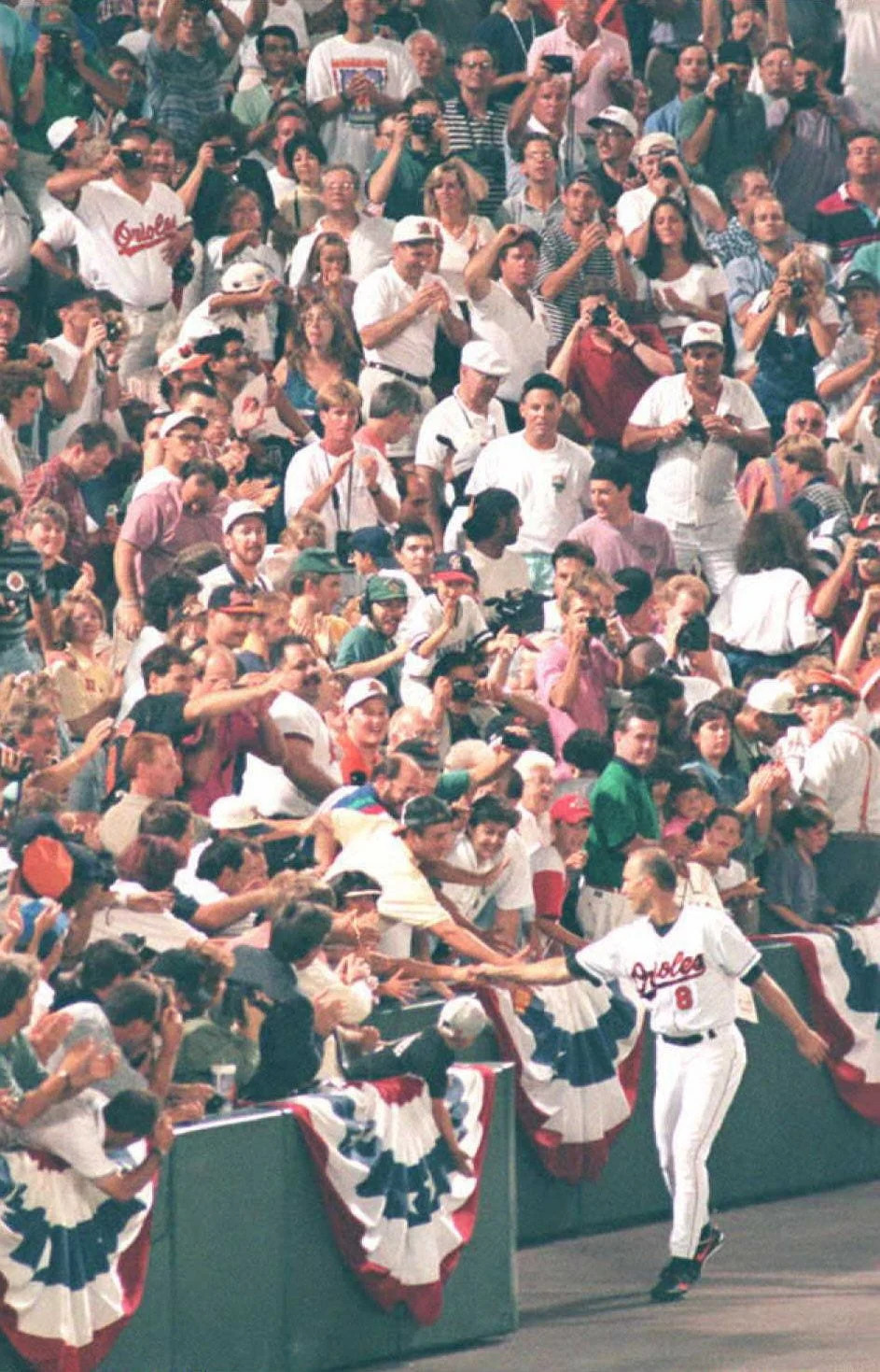 Cal Ripken Jr. reaches over the outfield wall to shake hands with cheering fans as one fan falls over the wall at Camden Yards.