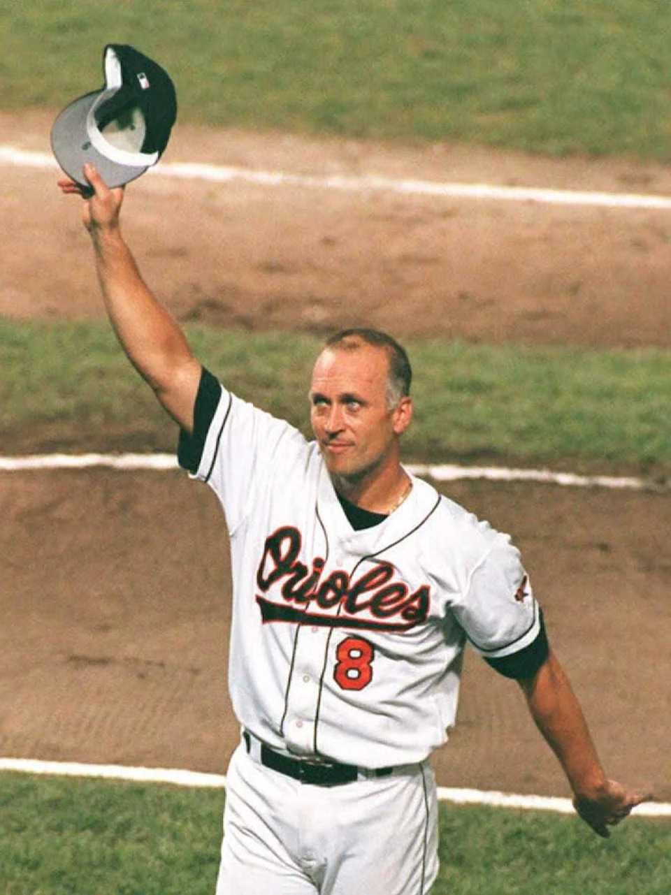 Cal Ripken Jr. tips his hat to the fans in the middle of the fifth inning at Camden Yards.