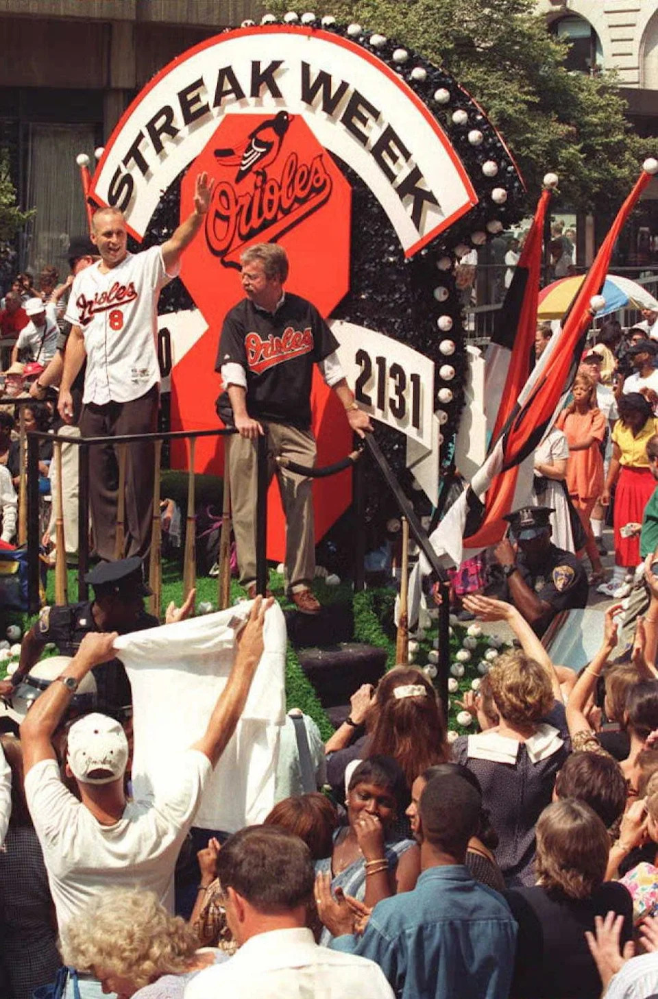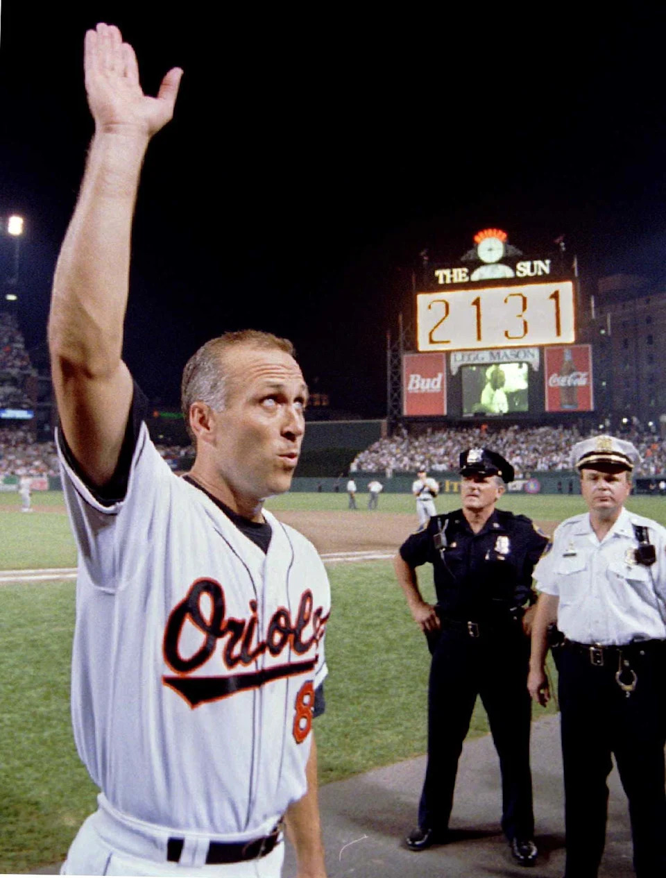 Cal Ripken Jr. acknowledges fans as the game became official to set the record of 2,131 consecutive games played, September 6, 1995.