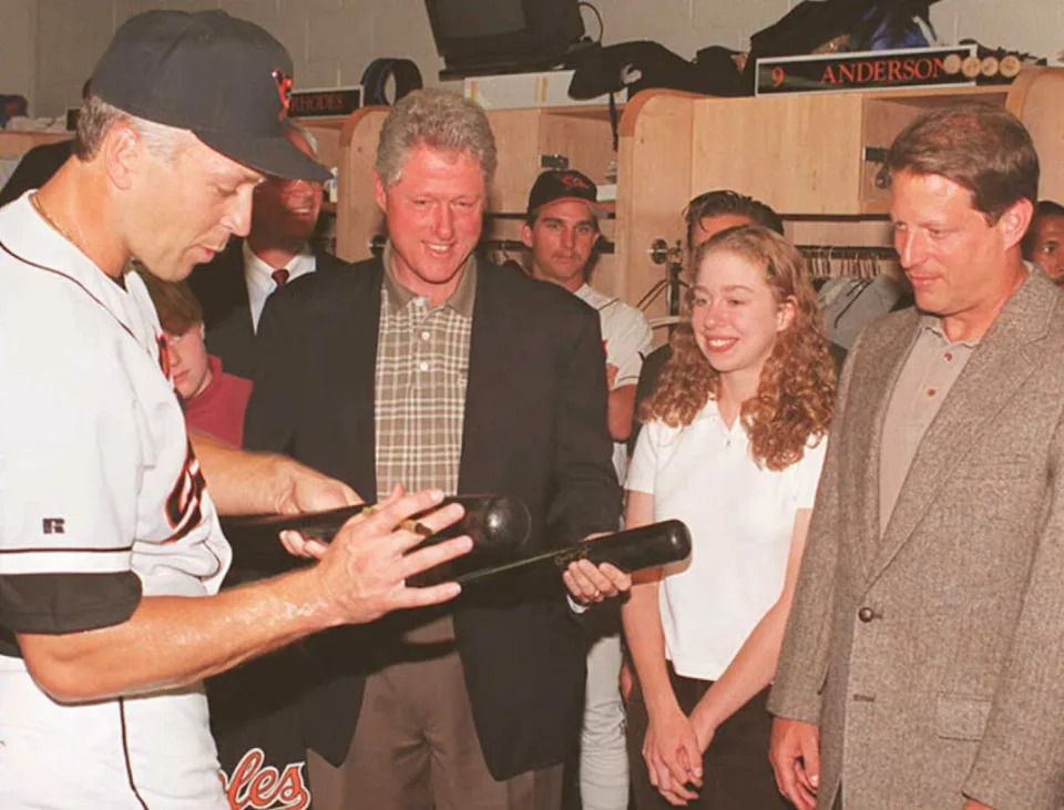 Cal Ripken, Jr. autographs a baseball bat before presenting it to US President Bill Clinton, his daughter Chelsea and Vice President Al Gore.