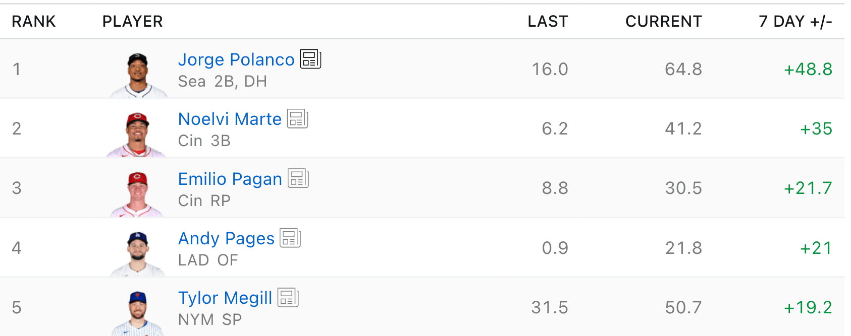 The Reds duo of Noelvi Marte and Emilio Pagán also find themselves on the list of popular adds again. Marte has been awesome, proving why he was a top prospect once upon a time (the beginning of last year), while Pagan has become the de facto closer for the Reds.