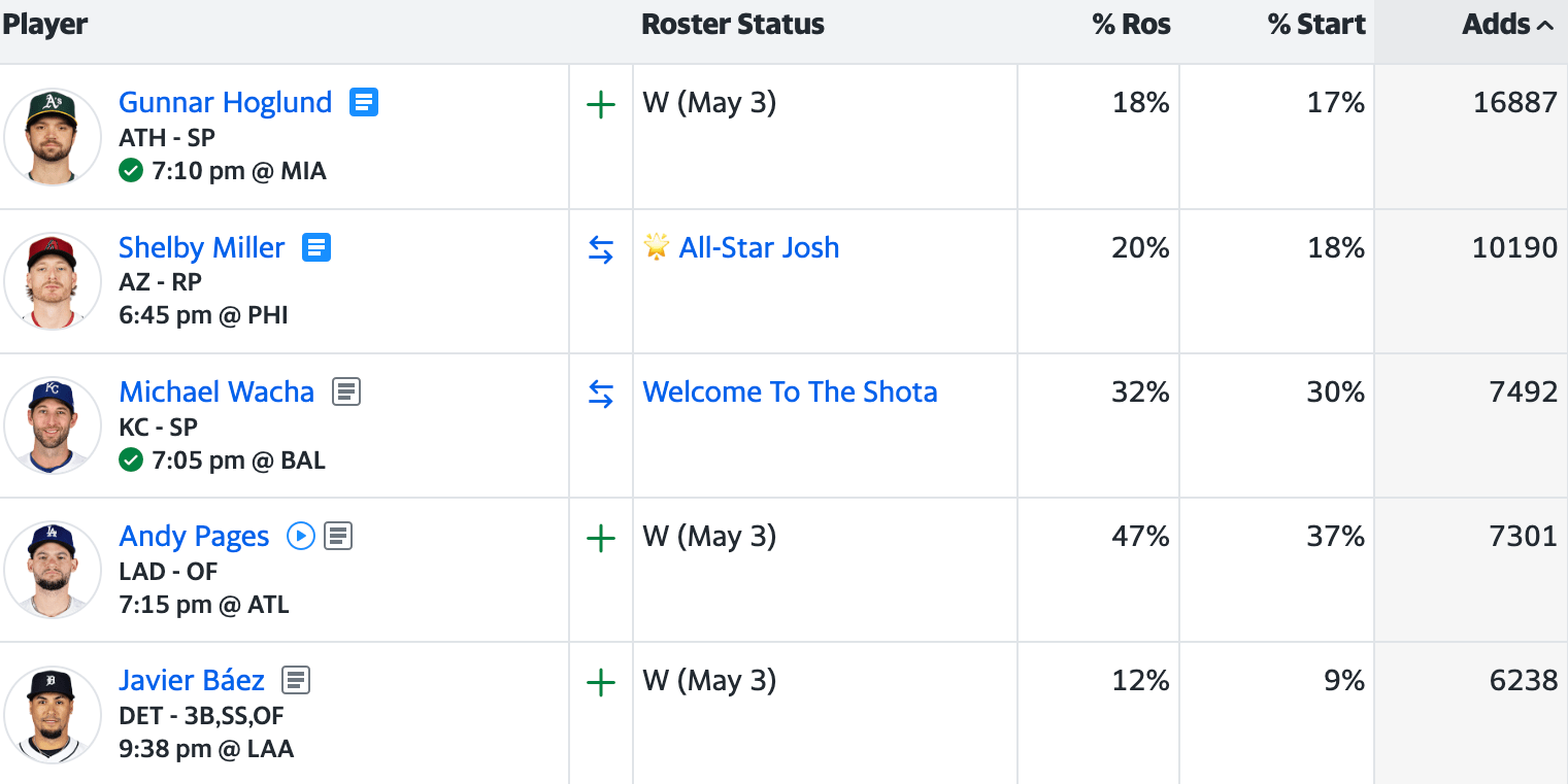 For today’s streamer adds, we saw two players on the opposite side of the spectrum. Gunnar Hoglund is a former first-round draft pick finally making his Major League debut, while Michael Wacha is the veteran we all know and love.