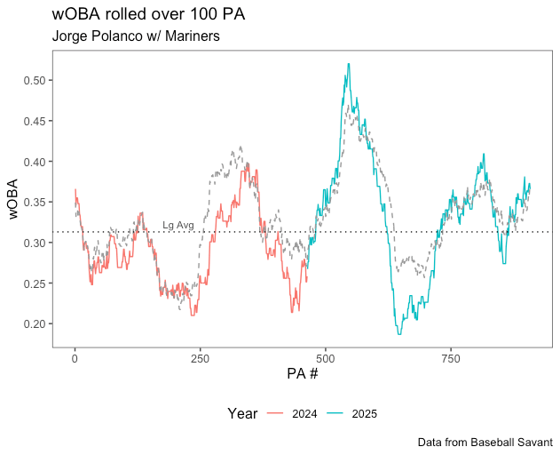 Some of that drop in performance is due to the stadium, some of that due to is injuries, and some of that is due to the limitations of this analysis — there’s more nuance to the conversation that I hope to explore in the offseason. But I bring this up to illustrate Polanco’s legacy with the Mariners at the end of 2024. He was another unfortunate name on a very real list of batters whose careers seemed to abruptly die in Seattle: