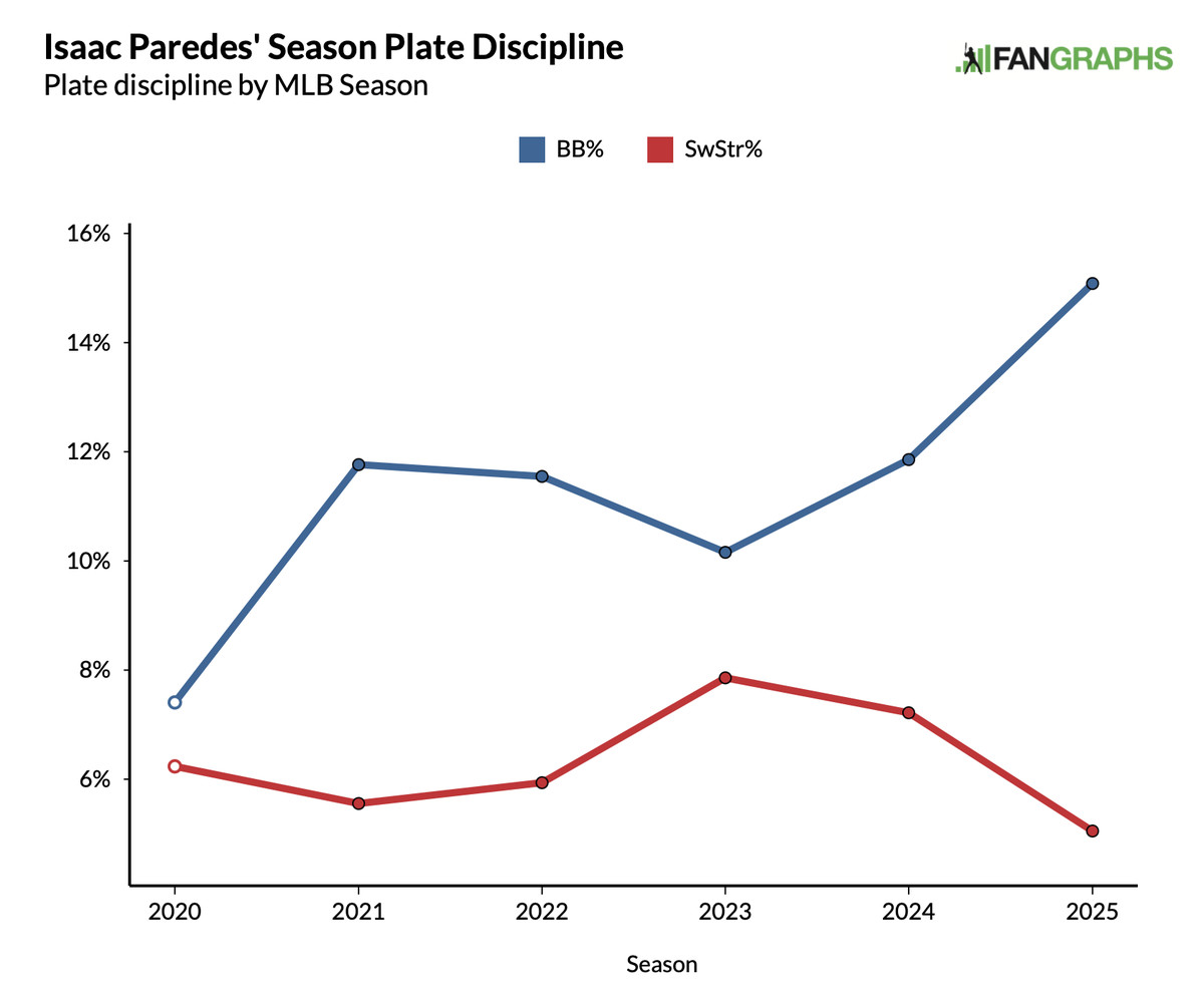 Throughout his time with the Tigers, Rays, and Cubs, Paredes was never known as an extreme strikeout hitter. Frankly, strikeouts weren’t too much of an issue, with a career rate hovering around 17.1% entering this season. With the Astros, his strikeout rate has remained roughly the same as it has for much of his career, currently at 16.8%. But his walk rate has improved by a noticeable margin, up from 11.2% for his career to 15.1% for this season.