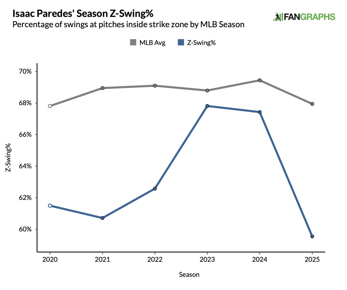 The Astros made it a point entering Spring Training to draw more pitches during their plate appearances, and they are achieving that goal, although they have improved only from 3.65 pitches per plate appearance in 2024 to 3.80 in 2025. Paredes’ inclusion in this lineup—he averages around 4.27 pitches per plate appearance for his career—has contributed to this goal. However, Paredes is still drawing nearly the same number of pitches this season as he has for his career. Instead, you can likely thank better swing decisions in general for this increased walk rate and improved offensive production. In fact, Paredes has become more selective at which pitches he swings at, especially inside the strike zone.