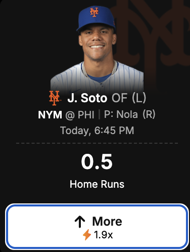 Home runs have been Nola’s largest problem. He is allowing 1.96 home runs per nine innings this season and 2.76 against left-handed hitters. Juan Soto has some of the best numbers against right-handed pitching on the Mets with a .576 slugging percentage, a 21.6% barrel percentage, and ridiculous 60.2% hard-hit rate. Soto has 29 home runs against right-handed pitching this season, including four home runs across his last 10 games against righties. Soto has three home runs across 38 at-bats against Nola in their careers. New York paid Soto a massive contract for matchups like this, so look for him to put one over the fence against their division rivals.