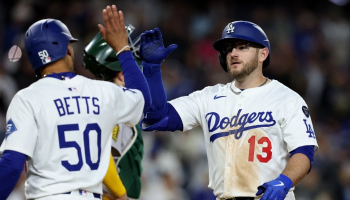 Los Angeles Dodgers third baseman Max Muncy (13) celebrates with shortstop Mookie Betts (50) after hitting a three-run home run during the eighth inning against the Athletics at Dodger Stadium in Los Angeles on May 14, 2025. — Reuters