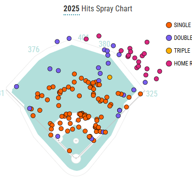 The initial clip to the behind-home view shows us Scott and RF Jordan Walker well on the left and right respectively of frame, leaving a larger gap in right-center than I can recall for a LHH in some time. Sure, Naylor sprays the ball more than many, and Scott’s range is immense, but if you were setting up your defense, might you look at this spray chart and think “maybe a littttle shaded?”