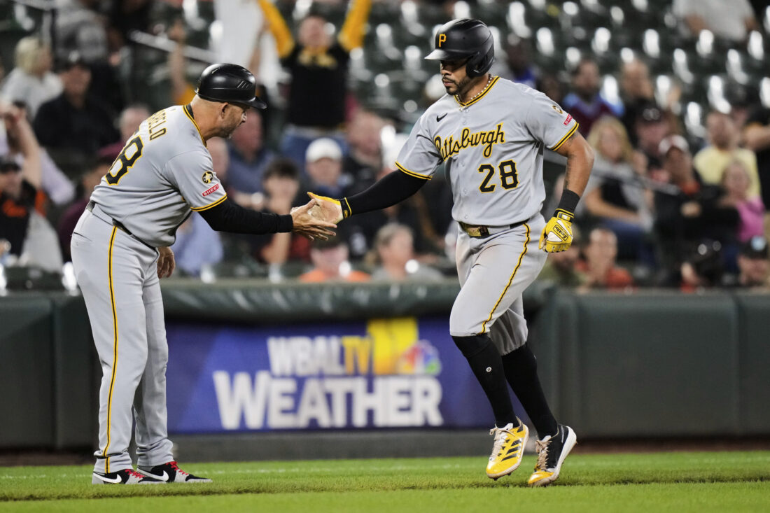 Pittsburgh Pirates’ Tommy Pham (28) celebrates with third base coach Mike Rabelo, left, after hitting a home run during the ninth inning of a baseball game against the Baltimore Orioles, Tuesday, Sept. 9, 2025, in Baltimore. (AP Photo/Stephanie Scarbrough)