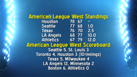 Toronto walked off Houston in the 10th for a 4-3 win. The helped the Mariners to within a game of the Astros in the American League West. Texas edged Milwaukee 5-4. The Angels blasted the Twins 12-2. Boston shut out the Athletics 6-nothing.