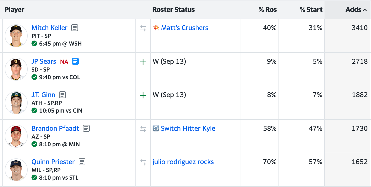 As it often has been, yesterday’s group of adds featured nearly a crop of pitchers all throwing that day.
