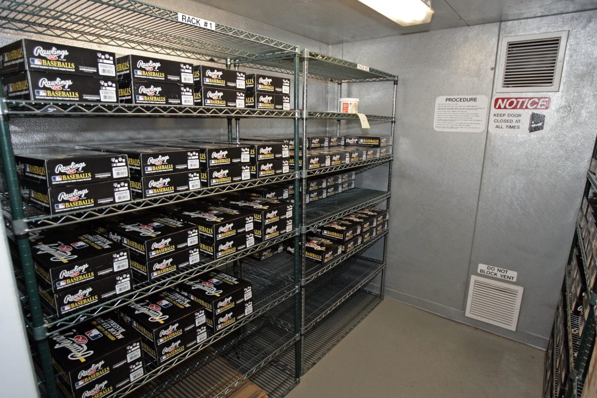 The famous Coors Field humidor is shown before Game 3 of the NLCS in Denver in 2007. The Rockies found baseballs were drying up and shrinking in Denver’s thin air but the humidor keeps them regulation size throughout the season. MLB has since standardized the practice across the league. (AP Photo/Ed Andrieski)