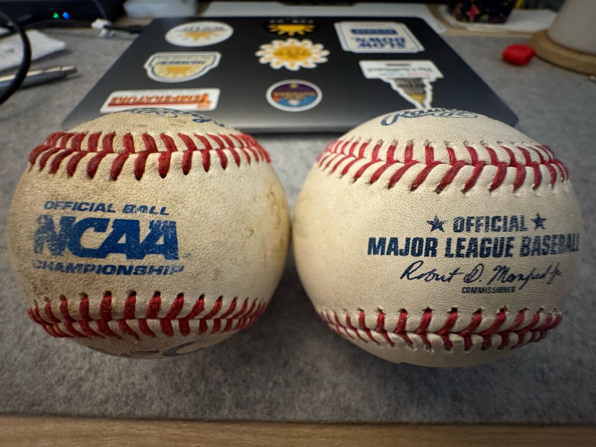 Two baseballs, one key difference: Slightly higher seams on the old NCAA ball. (John Ingold, The Colorado Sun