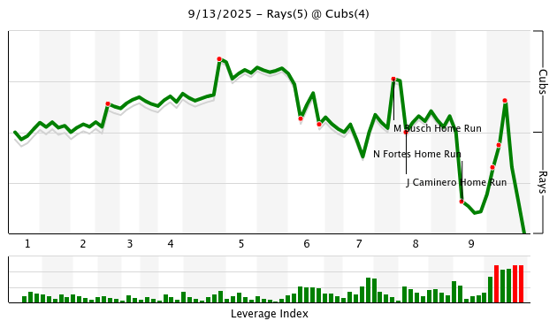 The Rays check in at 15.11 pitches per inning and the Cubs 15.88. The Cubs face two more batters. A lot of signs how close the game was. Interesting because the Rays pounded out 14 hits. They only drew one walk and that served Cub pitching pretty well. Three doubles, a triple and two homers. It’s frankly amazing the Rays didn’t put up more than five runs. The Cubs turned a double play and picked off a runner. But the big deal was the Rays leading eight and being 2-12 with runners in scoring position.