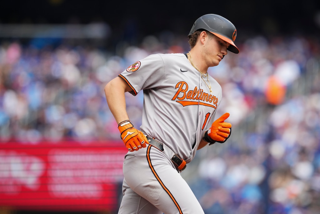 Coby Mayo rounds the bases after homering for the second straight day. (Mark Blinch/Getty Images)