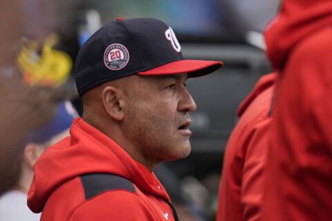 Washington Nationals interim manager Miguel Cairo (22) stands in the dugout during the sixth inning of a baseball game against the Chicago Cubs, Saturday, Sept. 6, 2025, in Chicago. (AP Photo/Erin Hooley)(AP/Erin Hooley)