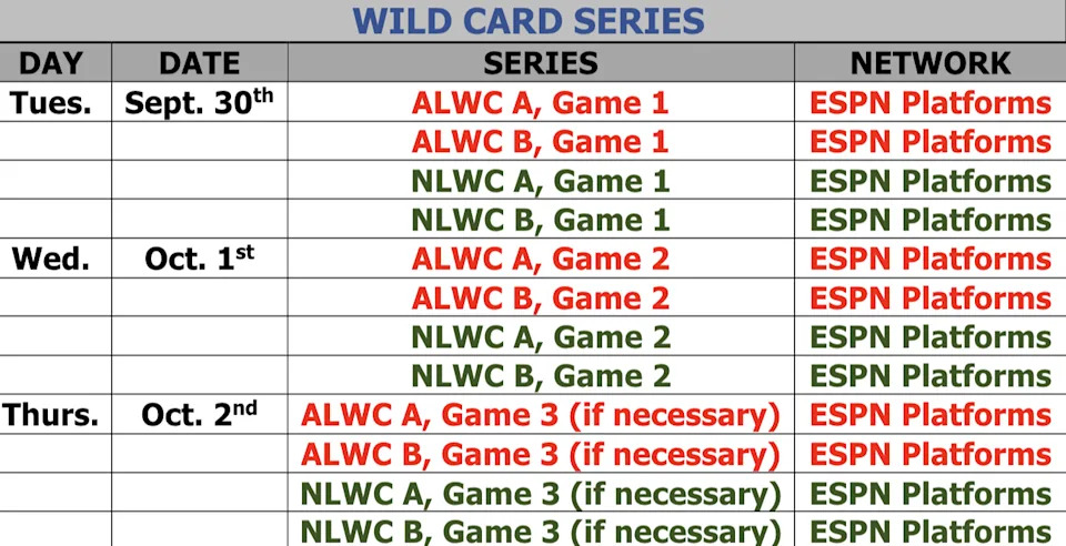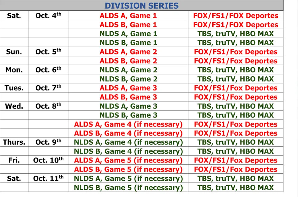 The respective Division Series would begin on Oct. 4 with Fox/FS1 carrying the ALDS and TBS/TruTV/HBOMax carrying the NLDS. The best-of-five could run until Oct. 11.