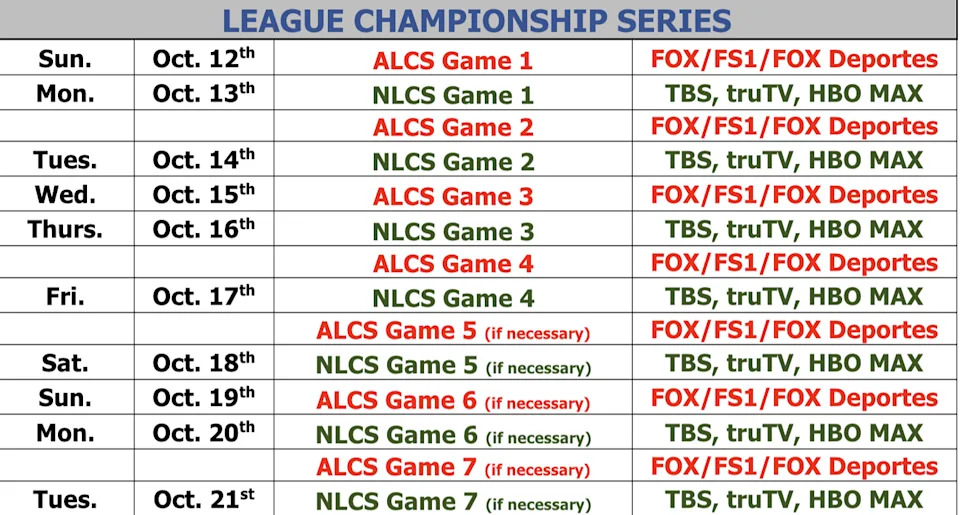 The Championship Series would begin Oct. 12 for the ALCS and Oct. 13 for the NLCS, concluding on Oct. 20 or 21, if they went the full seven games.
