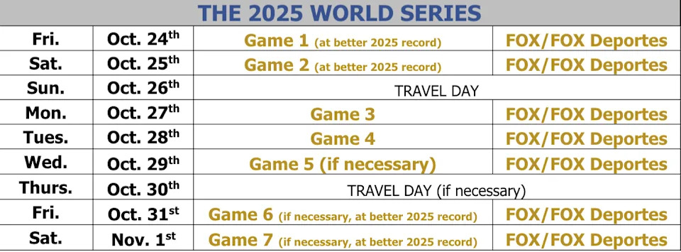 The World Series would begin Oct. 24 and would conclude Nov. 1, if it went the full seven games. That would be the latest World Series end in history.