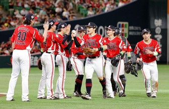 SoftBank Hawks players celebrate after beating the Seibu Lions 11-8 in an NPB game at Mizuho PayPay Dome in Fukuoka on Sept. 17, 2025. (Kyodo)