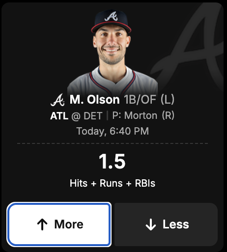 Create a Pick Set by choosing 2+ players from the same sport and Pick Group (a set of picks available from a group of set competitions). For each player, simply select if you think they’ll have more or less than their listed stat projection. In each Pick Set, you can not pick the same player twice and you must pick players from at least two different teams.