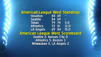 The Mariners and Astros are tied atop the American League West Standings, each with an 84-and-69 record. The Athletics beat Boston 5-3 while Milwaukee topped the Angels 5-2.