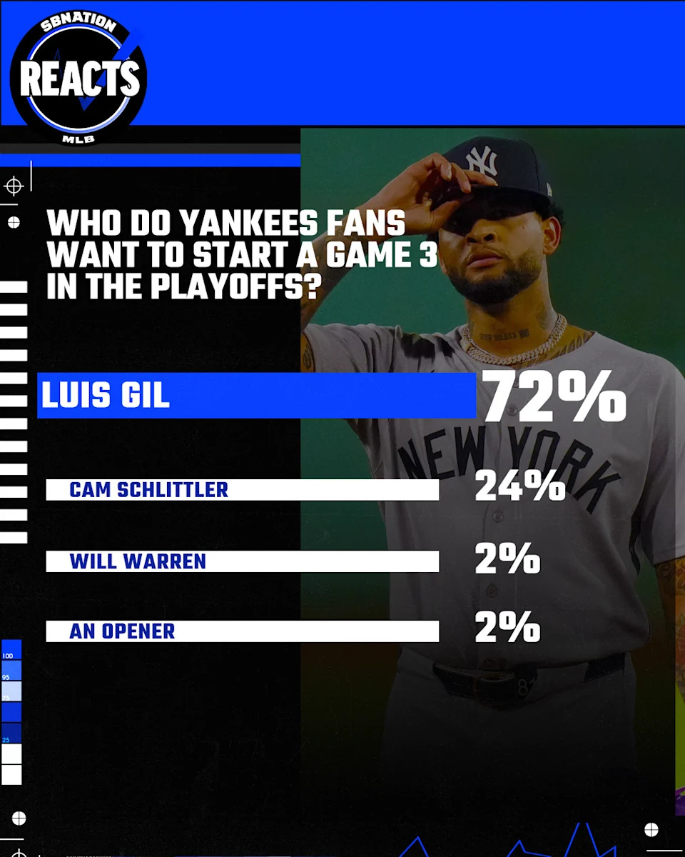 Not to be overly harsh on these talented young pitchers, but the process of making a choice here is one of elimination, in which anyone will inevitably pick the option they feel less bad about. Between Will Warren’s recent struggles in big games (especially in opening innings) and the lack of experience from the rookie Cam Schlittler, it’s natural that the overwhelming majority would gravitate towards what Gil. While the hard-throwing righty has been the least present of the trio this season, his experience—including a couple Game 4 starts last year—still surpasses that of both Warren and Schlittler.