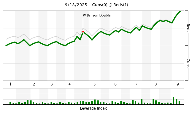 WPA Play of the Game: Will Benson’s one-out RBI double in the fourth. (.115) Interestingly, there were only eight plays in the entire game that registered positive WPA for a team. The Reds had only three players produce positive WPA game scores, so five between the two teams.