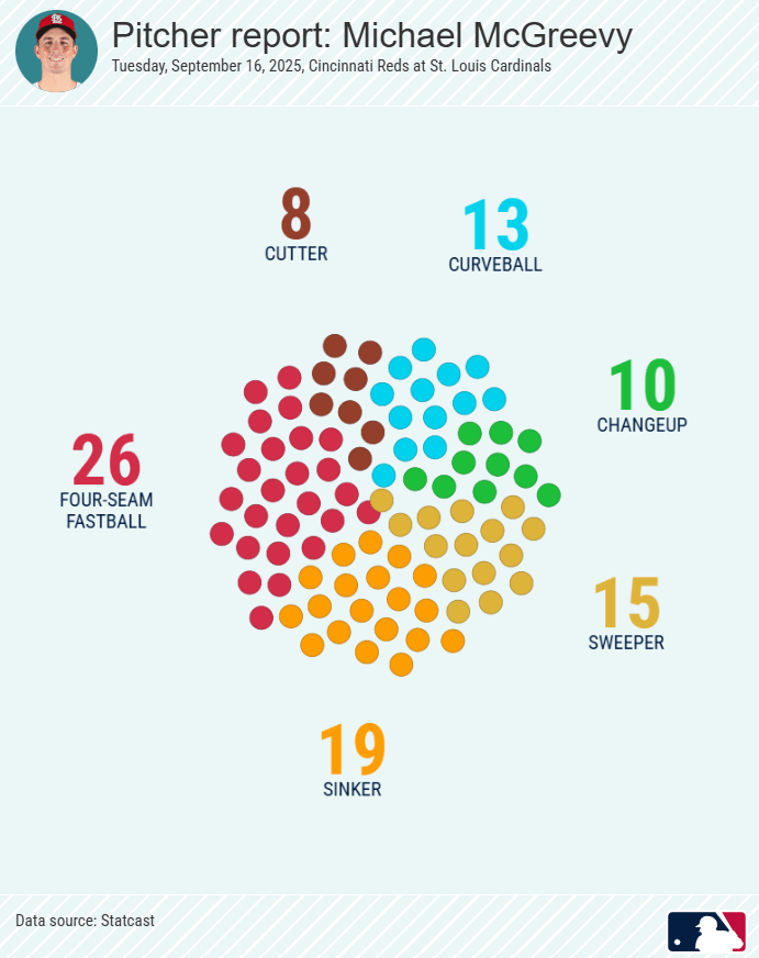 McGreevy came into Tuesday’s start with one of the deepest pitch mixes on the staff. He threw seven different pitches against the Reds, leaning most heavily on his sinker, sweeper, and four-seam fastball. None of them are overpowering, but together they form a toolkit built for contact management and sequencing.