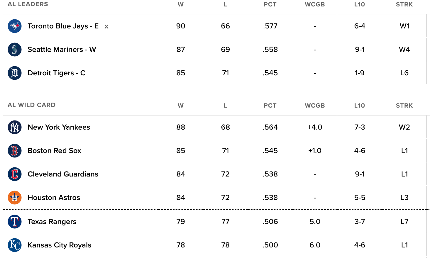 So to wrap things up here: the Red Sox, Tigers, Guardians, and Astros are four teams fighting for three postseason spots. One of those four teams definitely will not make the playoffs. And yet, according the percentage odds, each one of them is likely to make the playoffs.