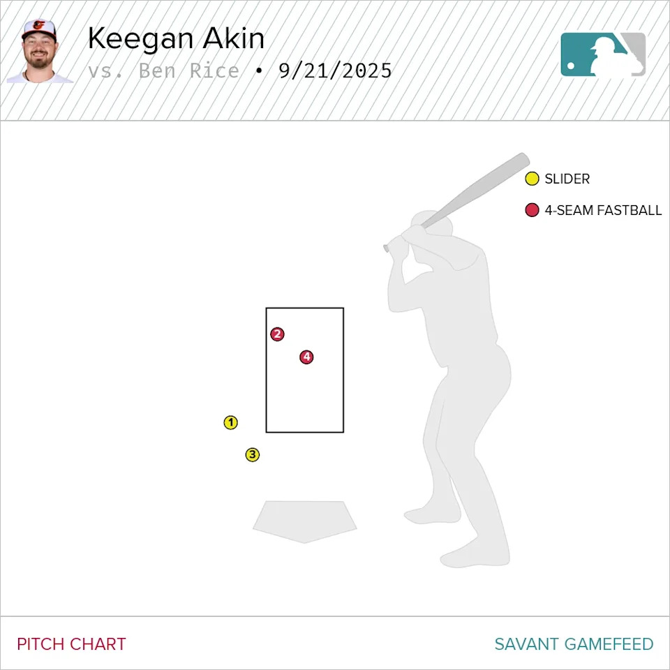 Despite getting the desired outcome on the previous pitch — a chase and weak contact — Akin moves off of the slider as he attempts to strike Rice out with an elevated four-seamer.
