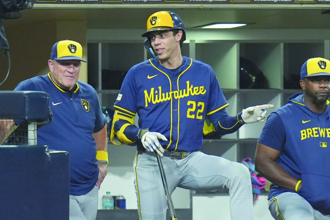Milwaukee Brewers’ Christian Yelich (22) talks with manager Pat Murphy in the dugout during the fourth inning of a baseball game against the San Diego Padres on Monday in San Diego. (AP photo)