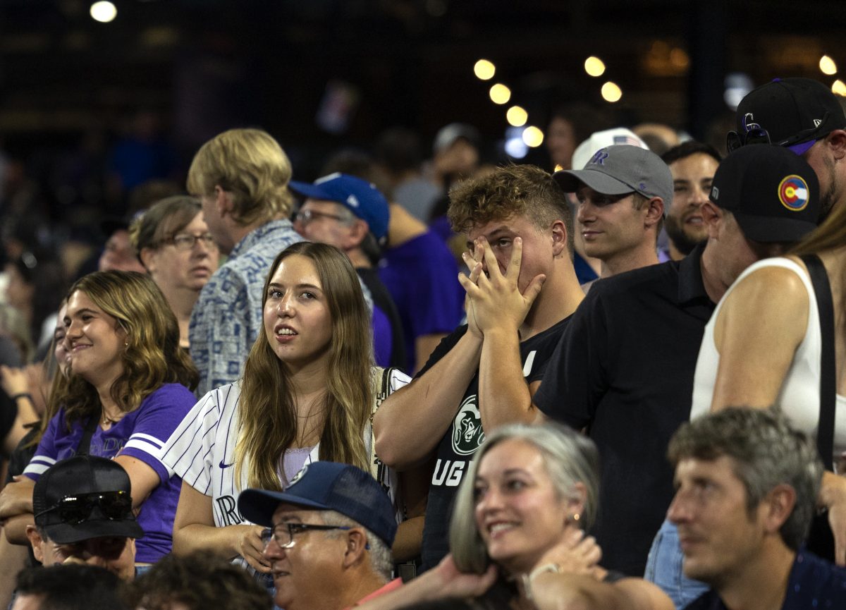 Rockies fans watch in disbelief late in a loss to the Arizona Diamondbacks on Aug. 15, 2023. (Hugh Carey, The Colorado Sun)
