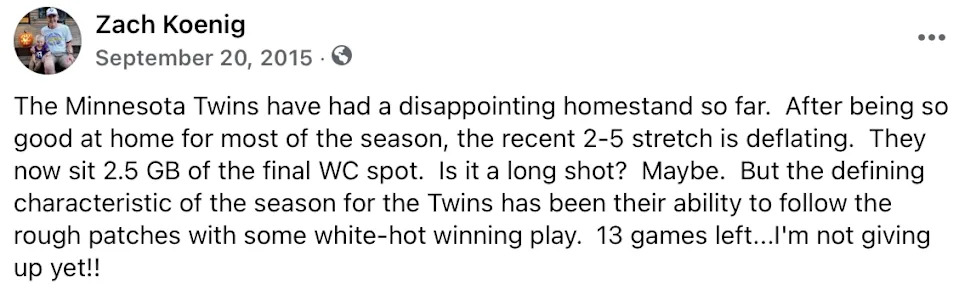 As the dog days of August 2015 came to a close, the Minnesota Twins looked to be falling out of the playoff race—even Wild Card contention. The early season mega-optimism had seemingly given way to regression to the mean.
