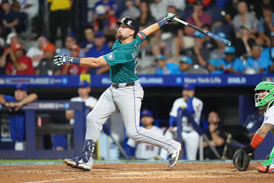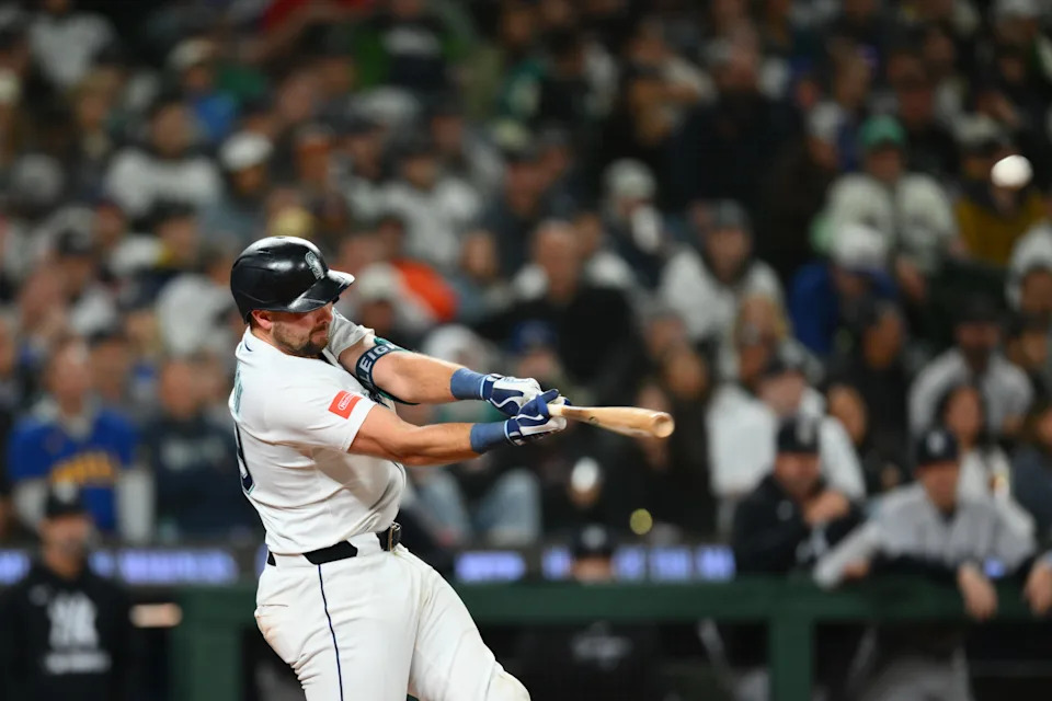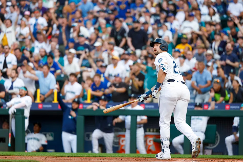 Cal Raleigh of the Seattle Mariners hits a two-run home run, tying him with Mickey Mantle at 54 for the most hit by a switch hitter in a season, during the first inning against the Los Angeles Angels at T-Mobile Park on Sept. 14, 2025, in Seattle.