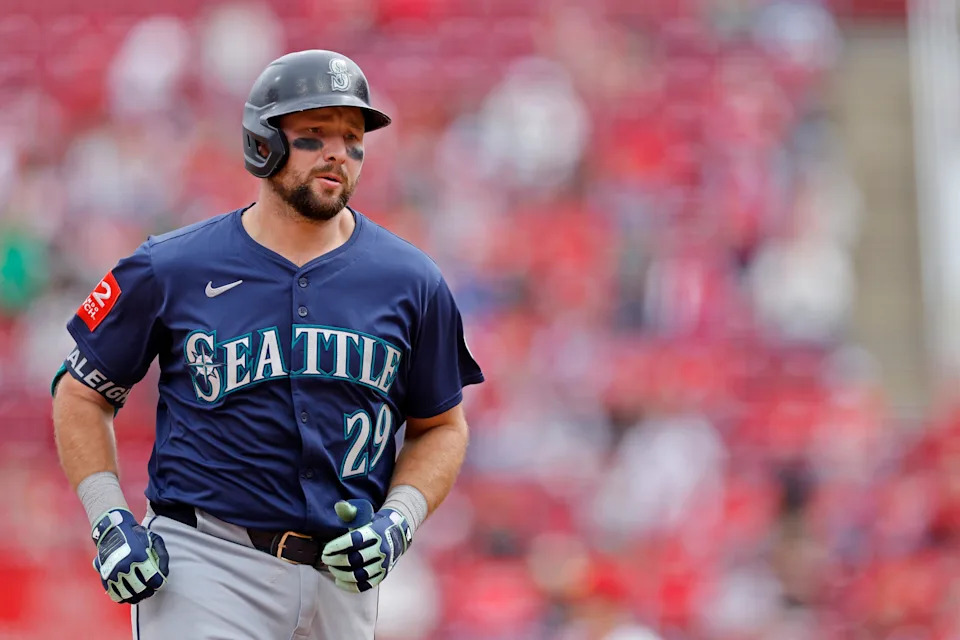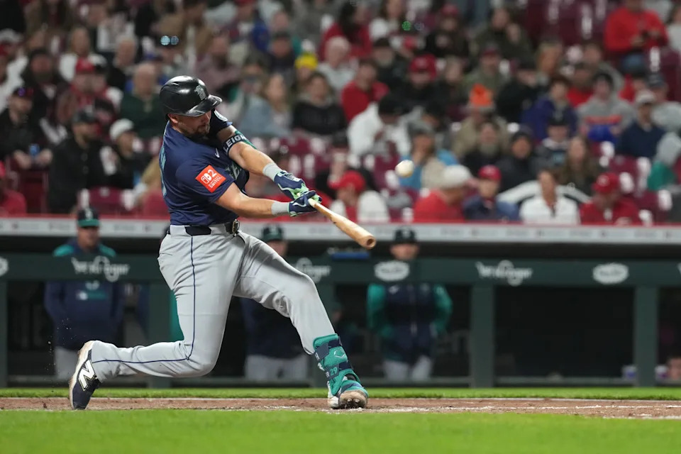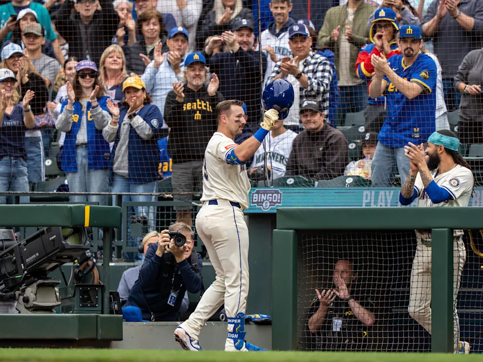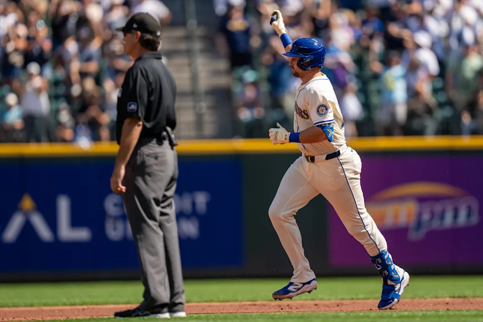 Cal Raleigh of the Seattle Mariners reacts to hitting his 24th home run of 2025 after hitting a two-run homer during the fifth inning against the Baltimore Orioles at T-Mobile Park in Seattle on June 5, 2025.