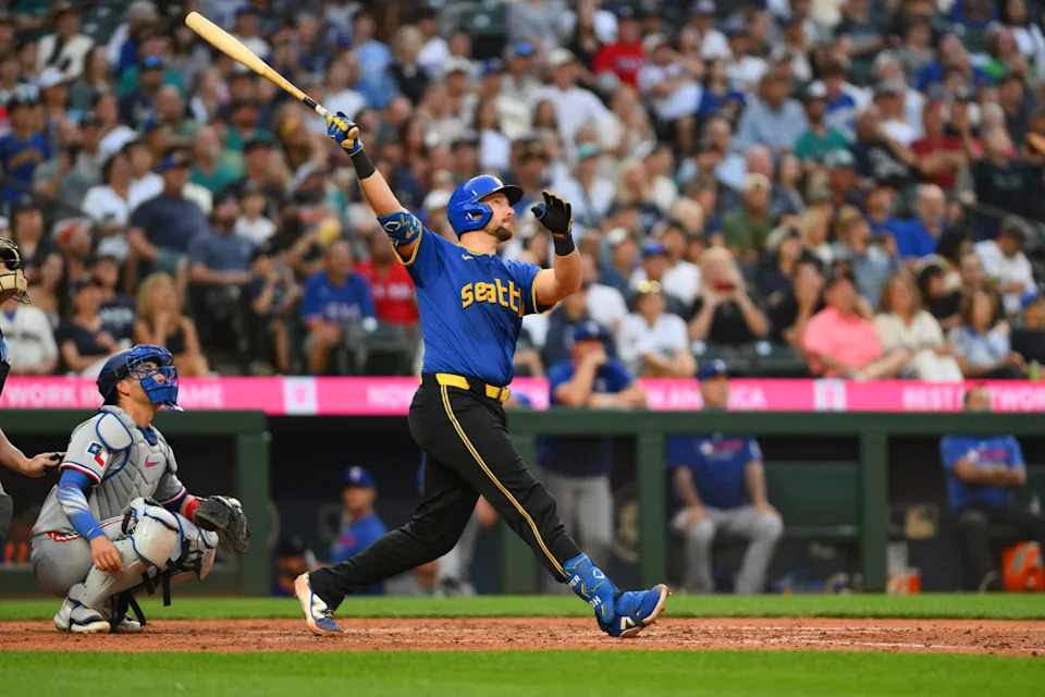 Seattle Mariners catcher Cal Raleigh hits his 42nd home run of the 2025 MLB season, a solo homer against the Texas Rangers during the fifth inning at T-Mobile Park in Seattle on July 31, 2025.